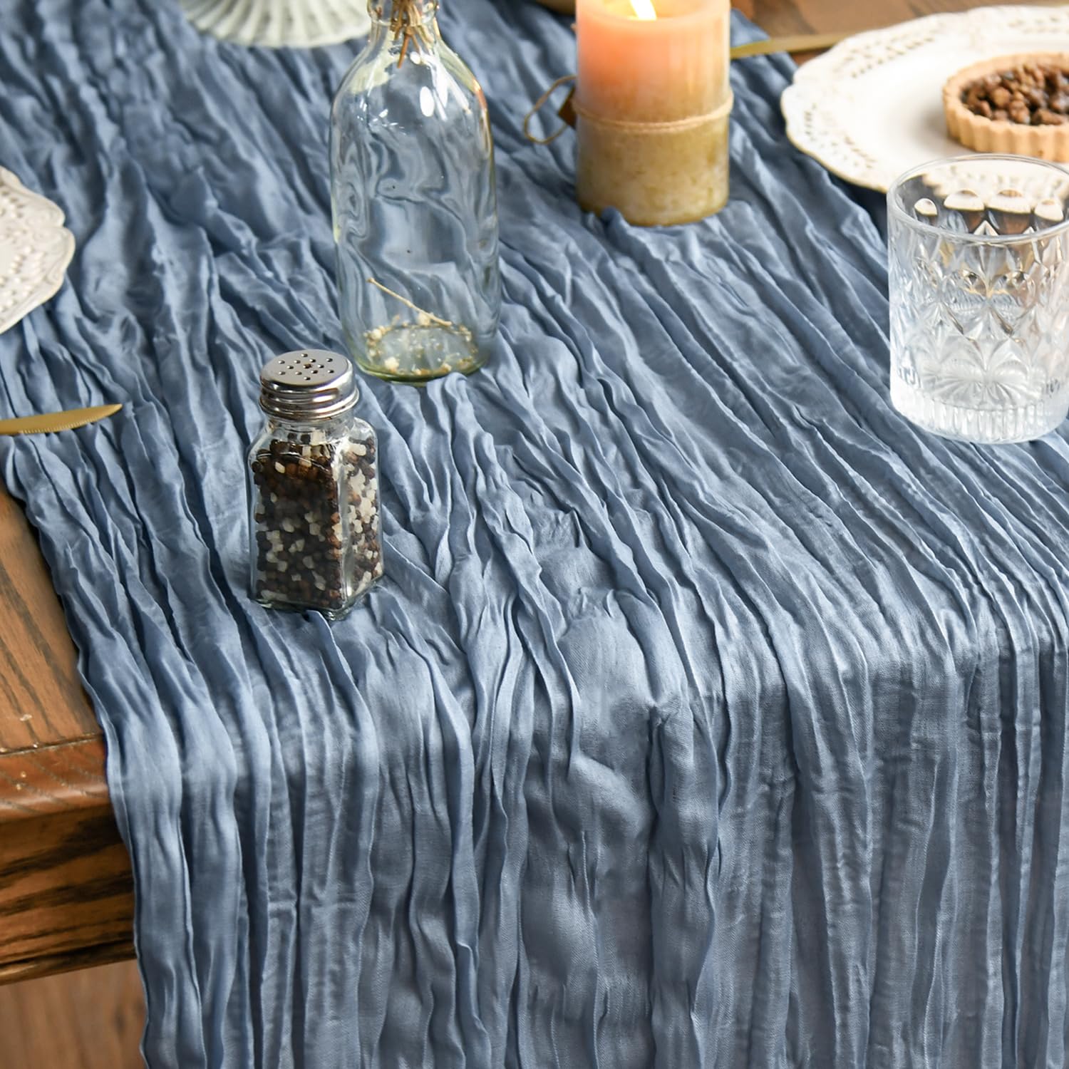Boho Cheesecloth Gauze Dusty Blue Wedding Table Runner, Seasonal Spring Fabric Kitchen Table Decoration Indoor Holiday Birthday Decor 35x120 Inch.