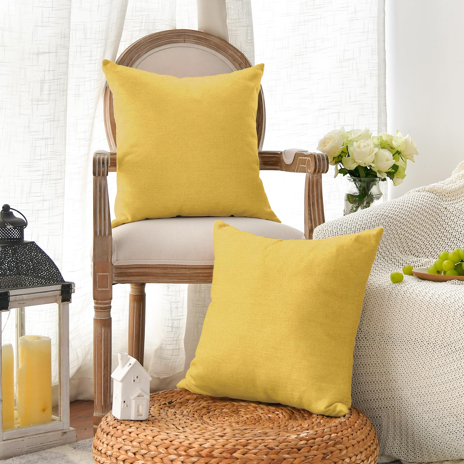 Pack of 2 Decorative Solid Throw Pillow Covers Polyester Linen, Modern Soft Living Room Cushion Cases for Couch Sofa Bed 16 x 16 Inch Yellow.