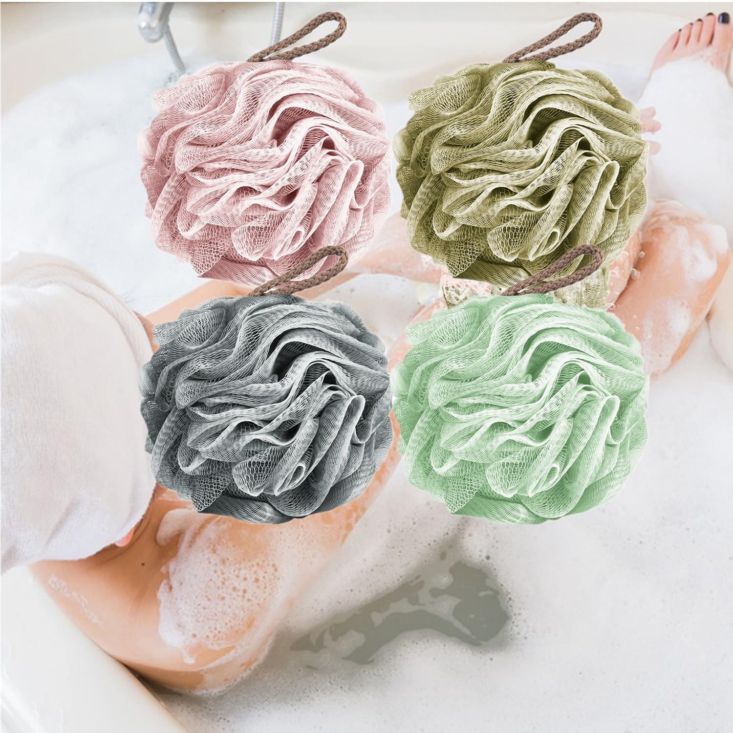 • The ebullient bath sponges comprise four distinct entities, each boasting a mesh composition with a diameter of 50 grams.