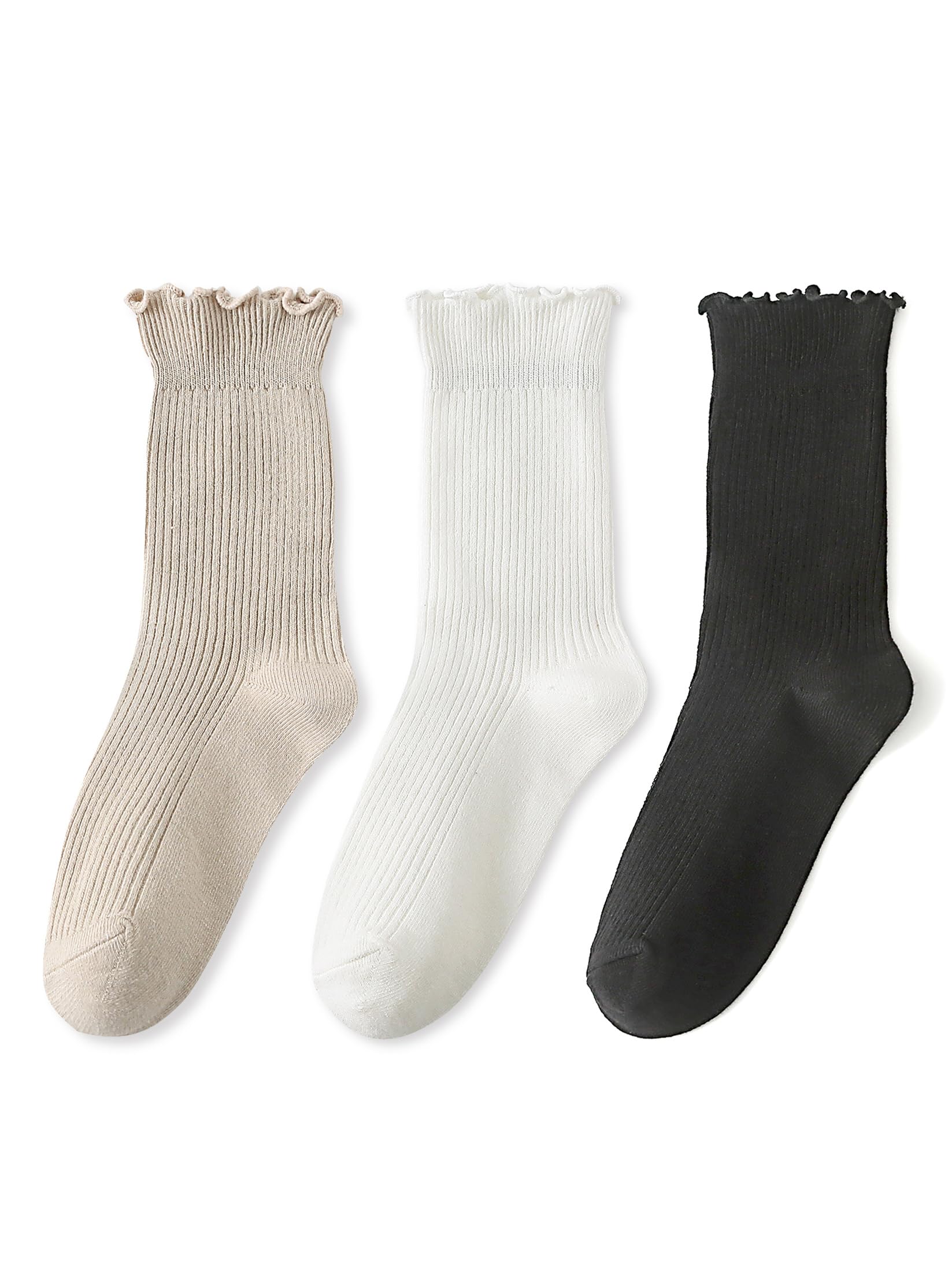 Ribbed crew design adds a touch of understated elegance to any outfit. — Cotton Turn-Cuff Womens Ruffle Socks - Cute Frilly Lightweight Ribbed Crew Socks 3 Pack Size 5-9 Black White Khaki — $5.49No Time To Read?