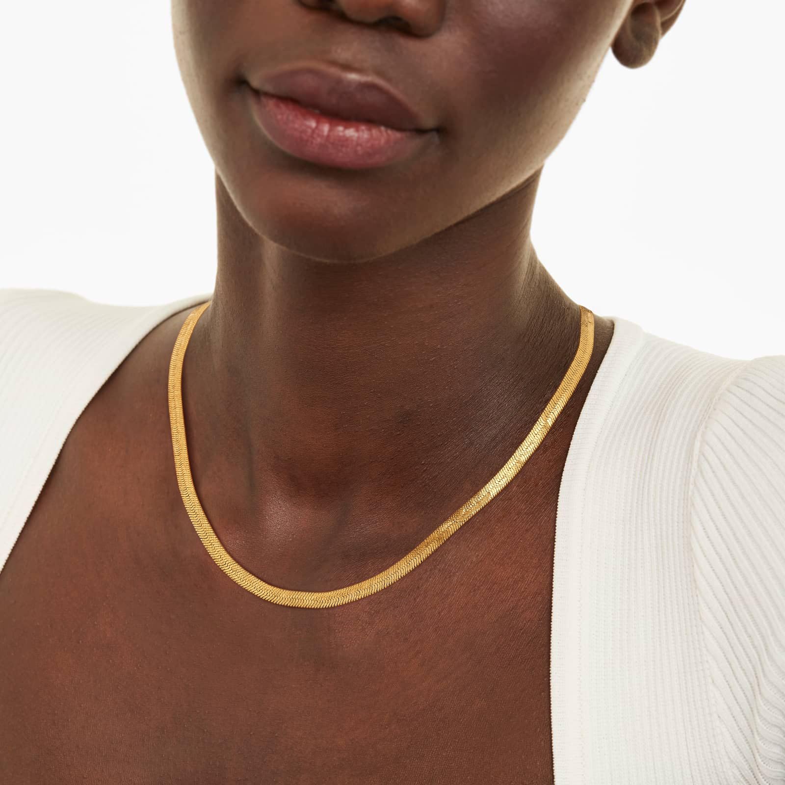 The choker-style design provides a comfortable and secure fit... ensuring that the necklace stays in place throughout the day. — Gold Flat Snake Chain Choker Necklace for Women 14K Gold Plated Dainty Gold Chain Necklace Jewelry — $8.99Get this here.