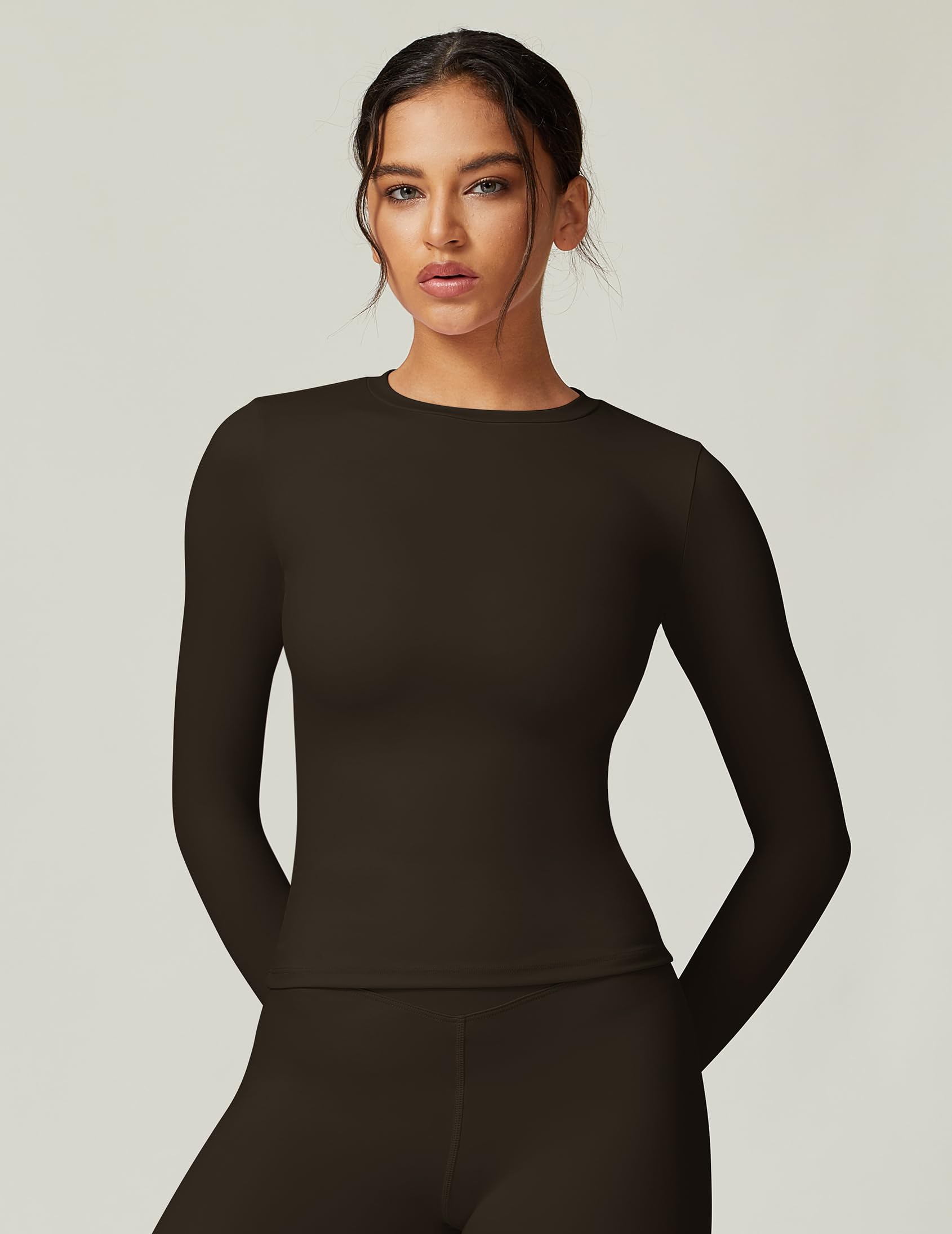 Stretchy material allows for a full range of motion, making it ideal for yoga, gym, and fitness training. — Women's Long Sleeve Fitted Crew Neck Stretch Top for Workout Yoga Gym Fitness Training (Brown, XL) — $12.70While it's hot.