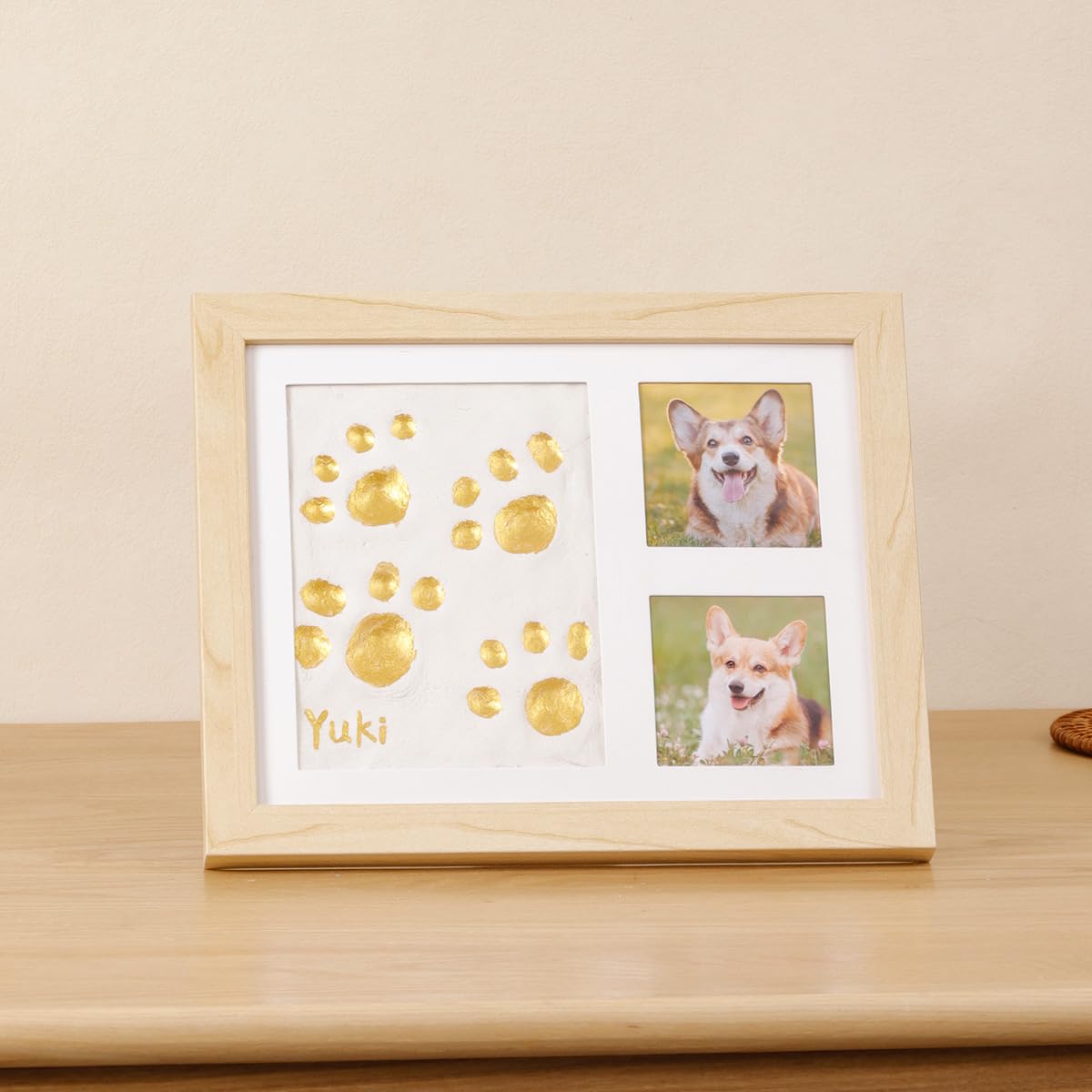 • Design: The natural wood finish and paw print design element work together to create a warm, inviting aesthetic that pet owners will appreciate.• Versatility: With two photo windows, users can display multiple photos of their pets, making it an ideal choice for showcasing a pet's ___ journey or favorite memories.